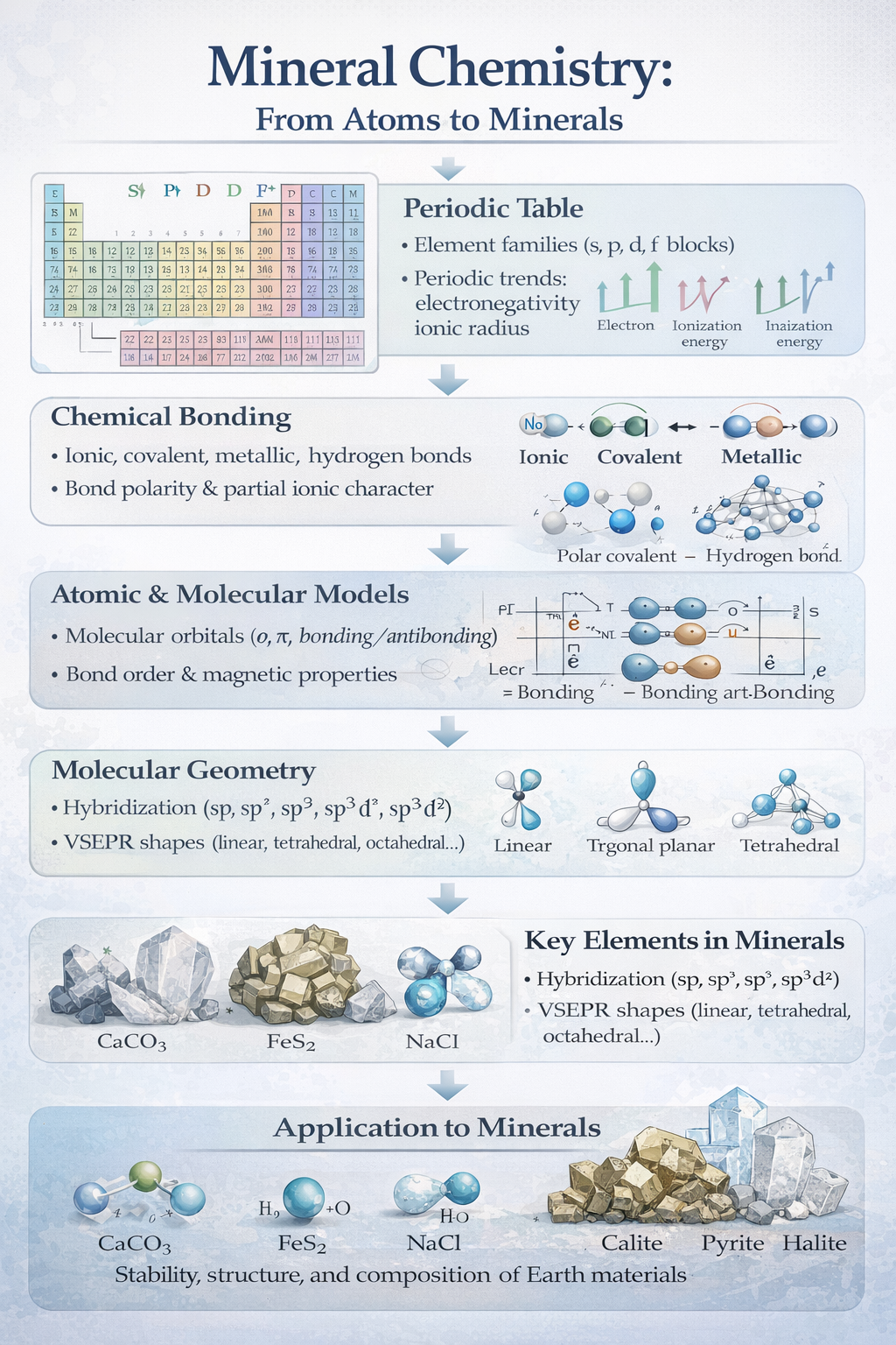 This second-year mineral chemistry course introduces the fundamental chemical principles governing minerals, with a strong focus on atomic structure and chemical bonding. It begins with the periodic table, emphasizing element families, periodic trends, and physicochemical properties such as ionic radius, electronegativity, and ionization energy. The course examines different types of chemical bonds—ionic, covalent, metallic, and weak interactions—and their role in mineral structures. Molecular orbital theory and bond energy concepts are used to explain mineral stability. Hybridization and VSEPR theory are introduced to understand molecular geometry. Special attention is given to major elements relevant to minerals, including hydrogen, oxygen, sulfur, halogens, and nitrogen. Their natural occurrence, chemical behavior, and common compounds are discussed. The course links atomic-scale properties to macroscopic mineral characteristics.
